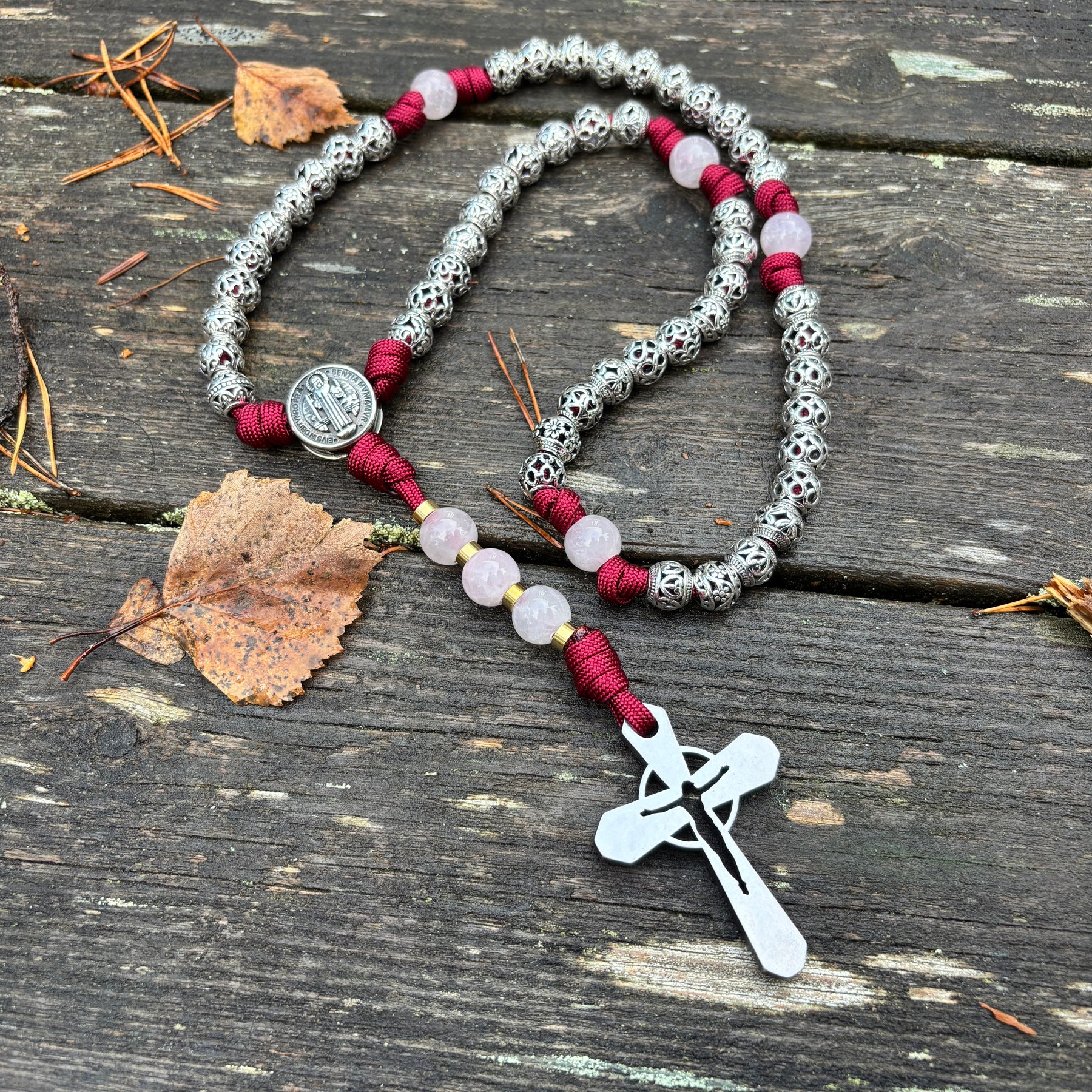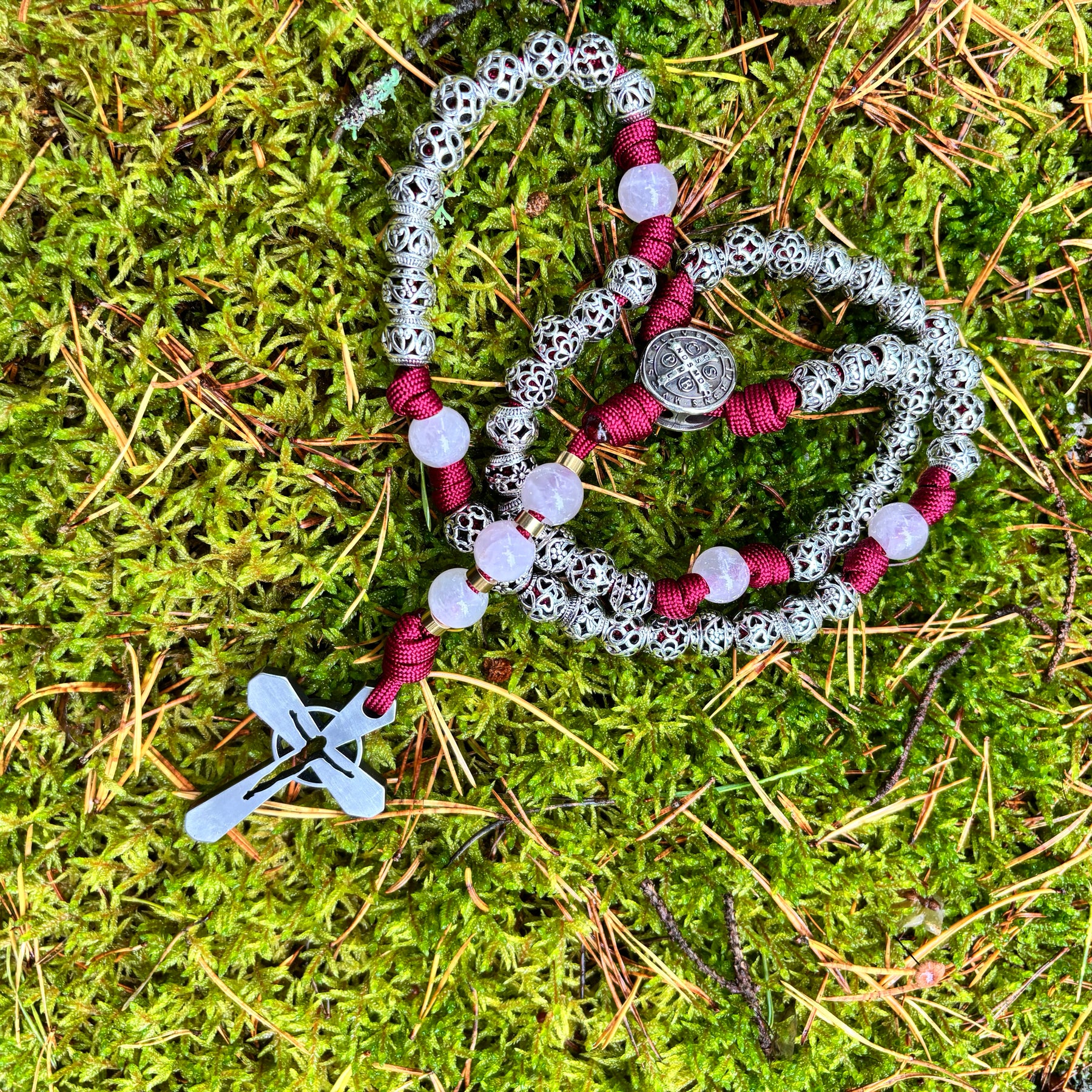 Pray in style! Special handmade Rosary on black 550 paracord with 50 metal filigree beads and 7 natural stones. Original double sided brass centerpiece with Saint Benedict medal. Kruger EDC handmade cross cut from 4 mm solid stainless steel.