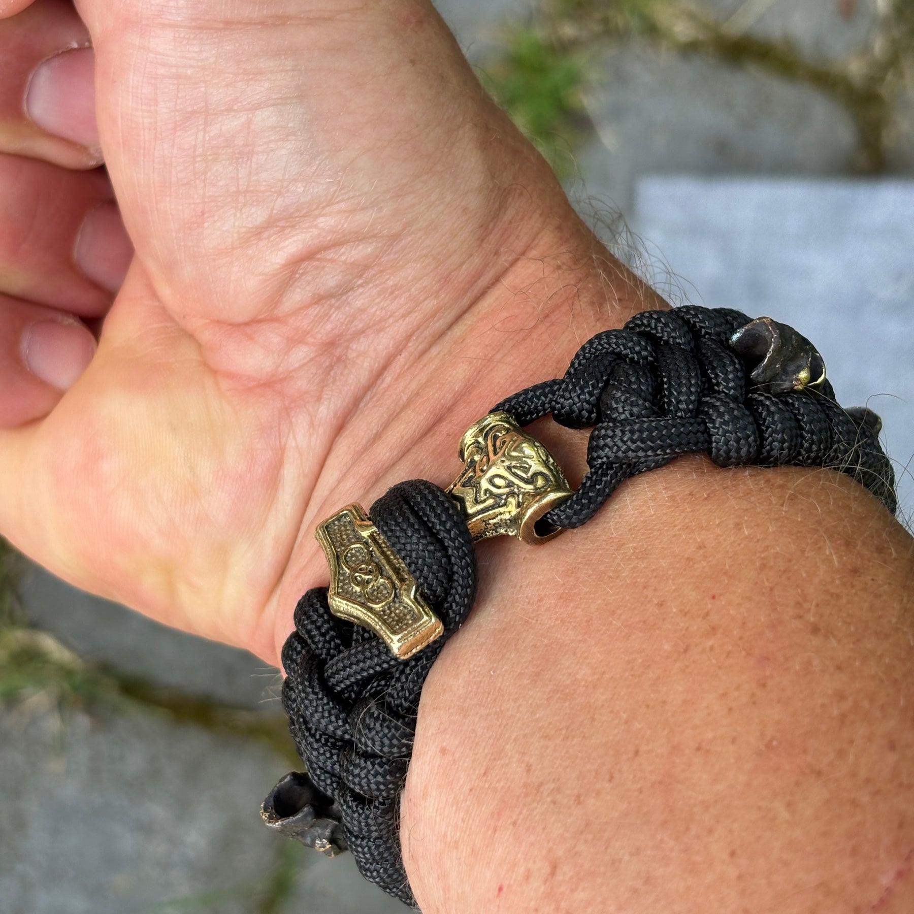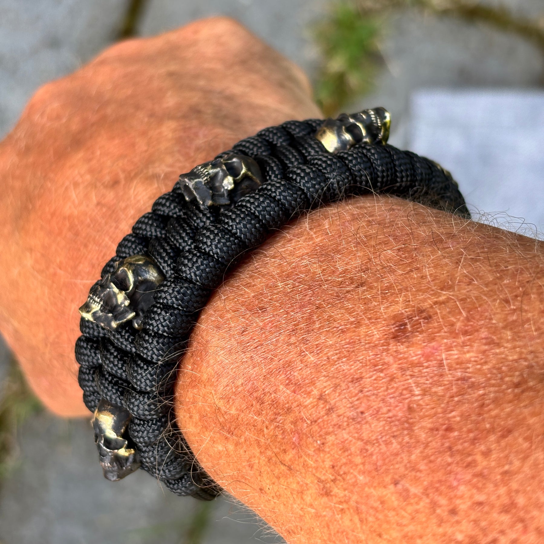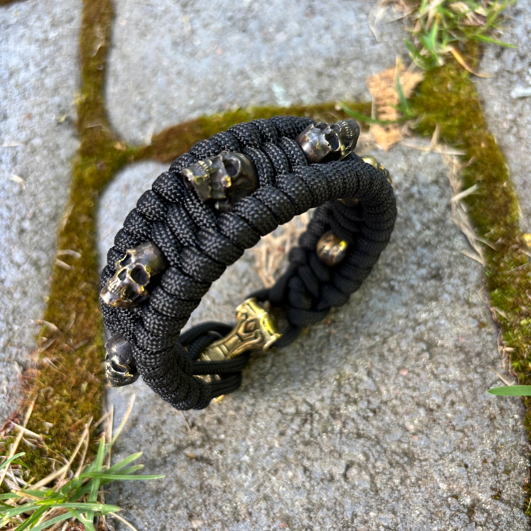 We know some of you want to get noticed. This one is for you. Only two bracelets available. Six of our luxury skulls and one Mjölnir - all in handmade brass, on a black paracord bracelet with red accent. Finished by a process of polishing and waxing.
