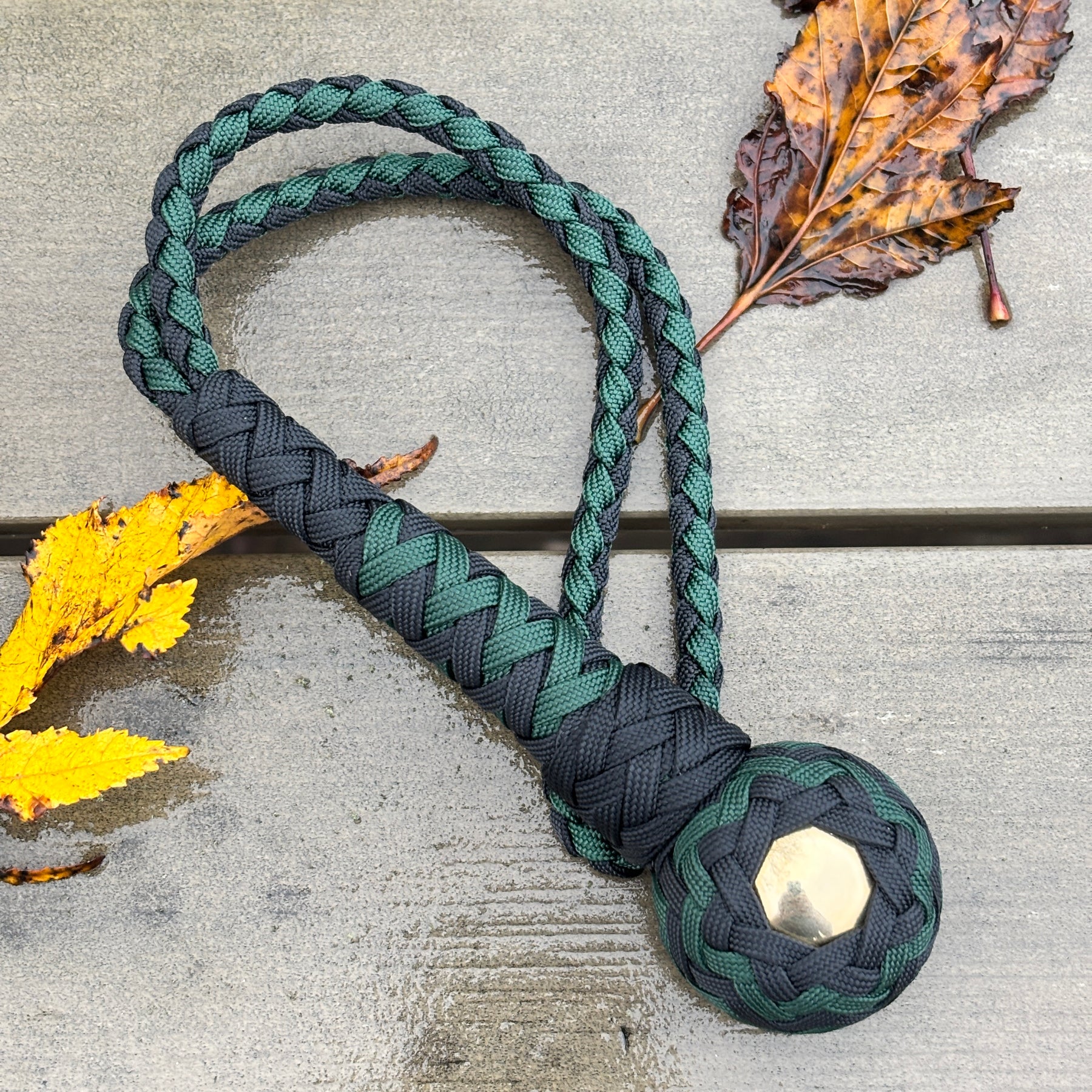 1.6 inch (40 mm) solid brass ball bearing and beautiful knotwork. This street companion is my heaviest version at 300 grams and approximately 35-40 cm length. This is cordwork at an advanced level which takes even an experienced weaver 3-4 hours of intensive work.